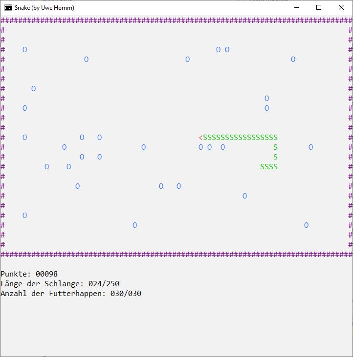In dem Screenshot weiter oben kann man dies sehen: Der Spielfeldrand hat die Farbe DarkMagenta, die Futterhappen haben die Farbe Blue, der Schlangenkörper wird in der Farbe Green und der Schlangenkopf in der Farbe Red dargestellt.