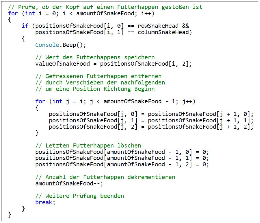 In meinem Programmcode lasse ich bei Fressen eines Futterhappens auch einen Ton erklingen. Dies macht die Methode Beep() des Konsolen-