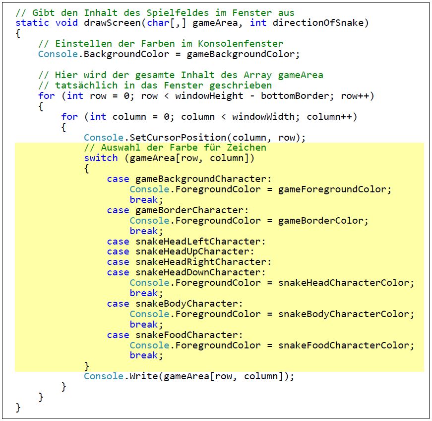 Ganz klar, für solch eine Fallunterscheidung verwenden wir wiederum die switch-Struktur. Wir untersuchen das per Write()-Methode auszugebende Zeichen und legen je nach Zeichen die entsprechende Vordergrundfarbe fest. Wenn für mehrere Fälle die selben Anweisungen auszuführen sind, kann man alle diese Fälle direkt untereinander auflisten, so wie eben bei den vier Zeichen für den Schlangenkopf, der ja immer die selbe Farbe haben soll. Der gelb markierte Block zeigt diese switch-Struktur zur Farbsteuerung bei der Ausgabe auf dem Bildschirm.