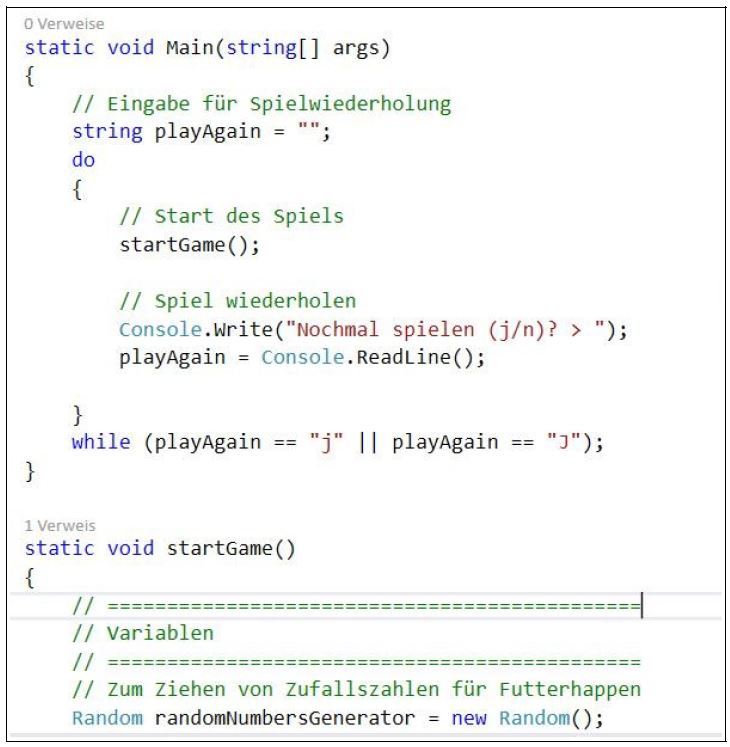 In der nun leeren Main()-Methode wird innerhalb der beschriebenen „äußeren“ do…while-Schleife diese Methode startGame() aufgerufen.