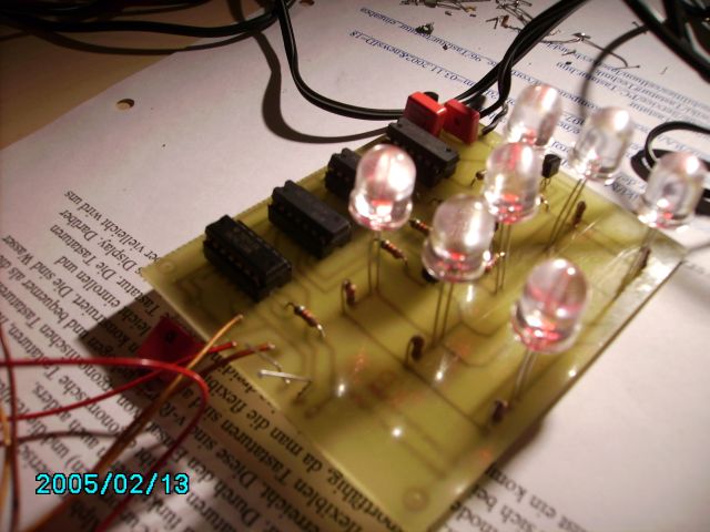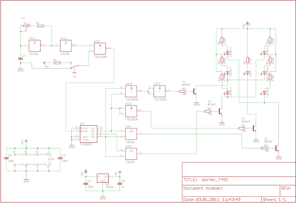Für die Schule habe ich mal vor einigen Jahren im Rahmen des Tages der offenen Tür im Jahr 2007 ein Bastelprojekt für die Jahrgangsstufe 11 unseres Beruflichen Gymnasiums erstellt. Zu diesem Zeitpunkt hatten die Schüler bereits Kenntnisse in der Digitaltechnik. Gut, die Ansteuerung der LEDs mittels Transistor und auch der Taktgenerator waren vorgegeben. Entwickeln konnten die Schüler den Zähler 0…5 und die Logik für die Würfelmuster. Erst wollte ich es in CMOS mit den 40xx machen, aber dann habe ich mich in guter alter Manier für die TTL Bausteine der 74er Serie entschieden.